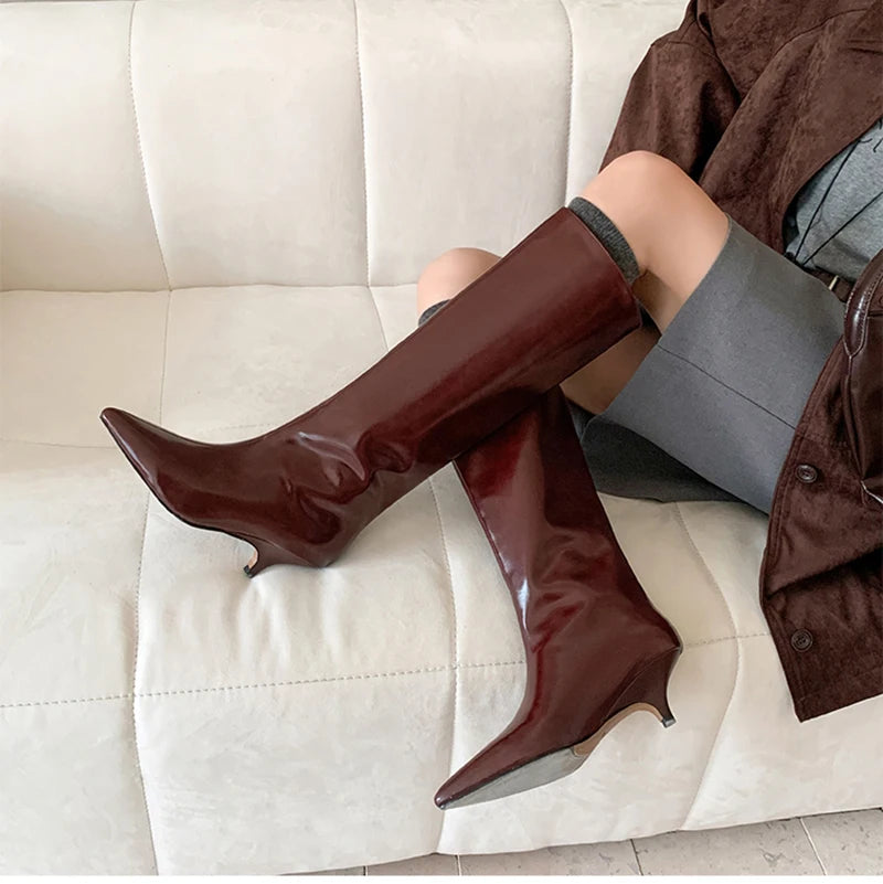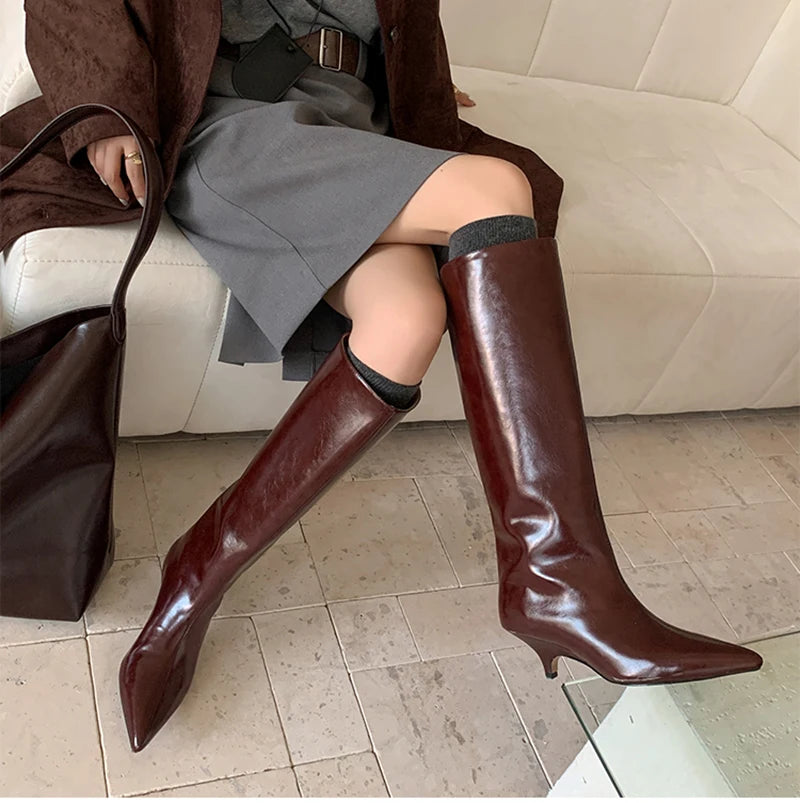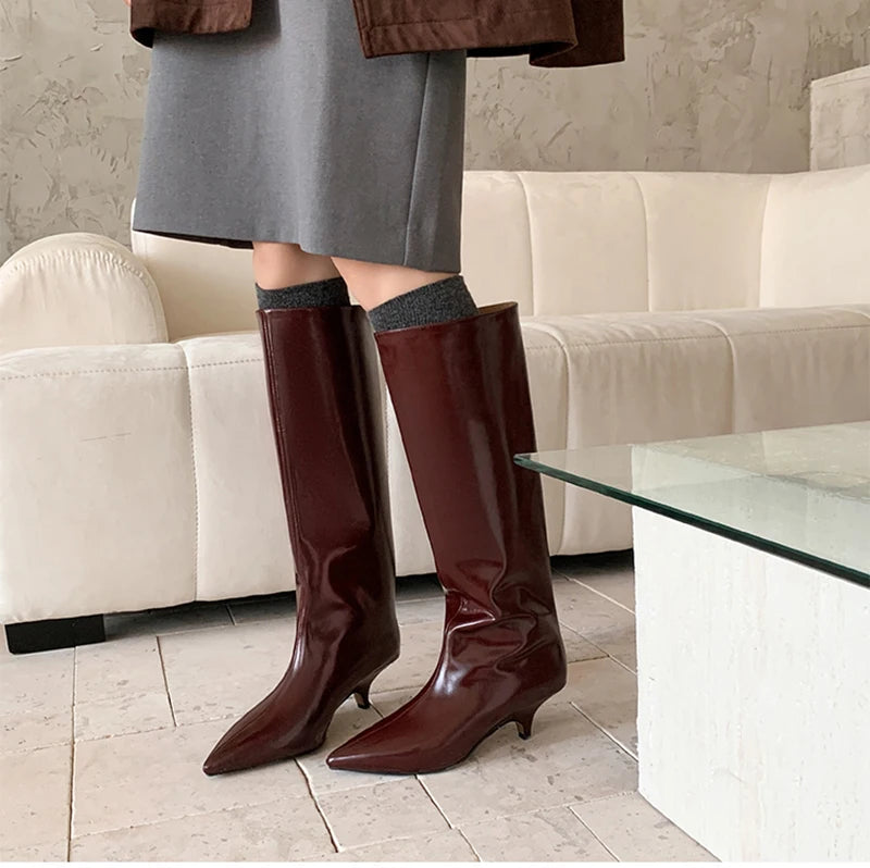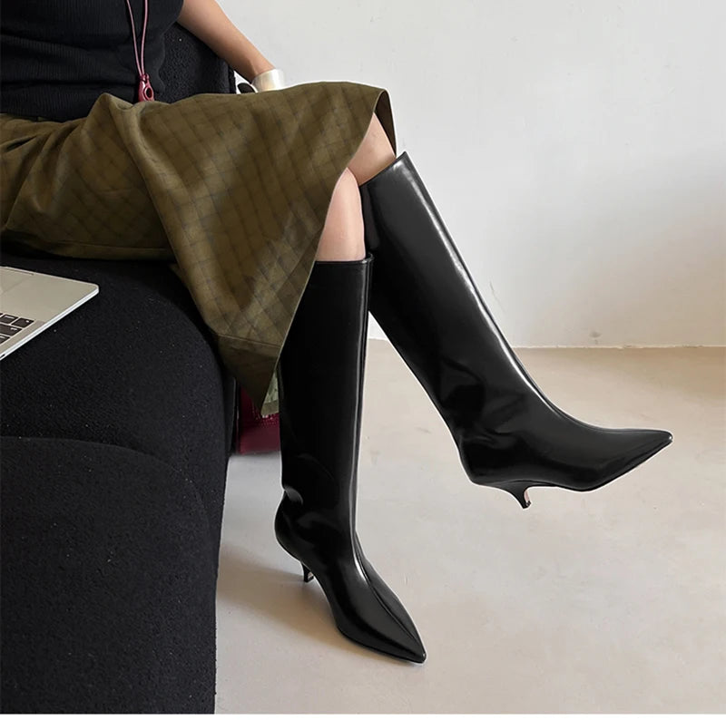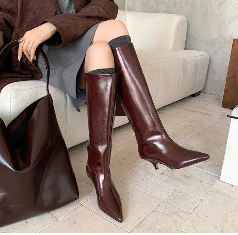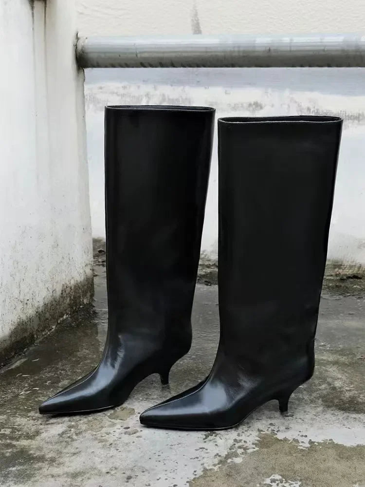 Stivali con gambale alto in ecopelle. Dettaglio di impunture sul top. Modello a punta.