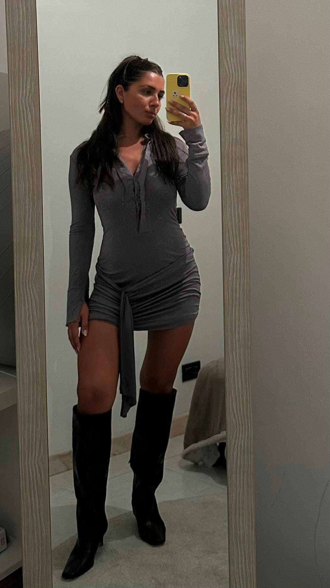 Vestito in maglina colore grigio. Parte superiore a camicia con colletto e allacciatura frontale con bottoncini nascosti, maniche lunghe. Parte inferiore aderente con particolare di fascia drappeggiata effetto nodo.