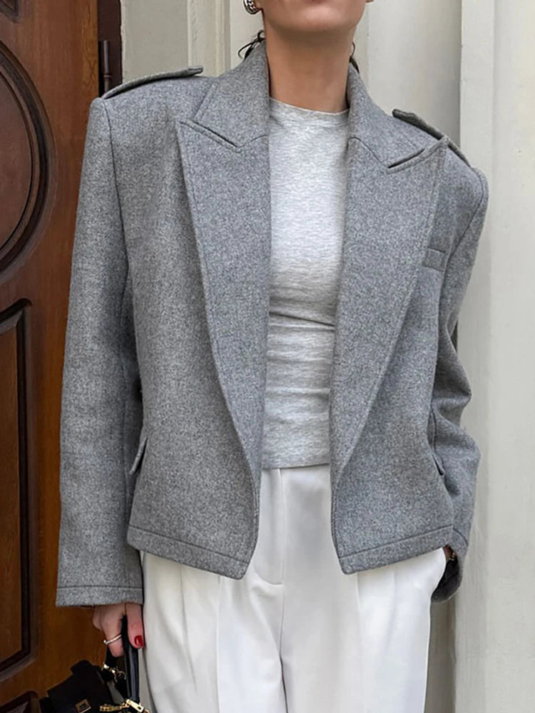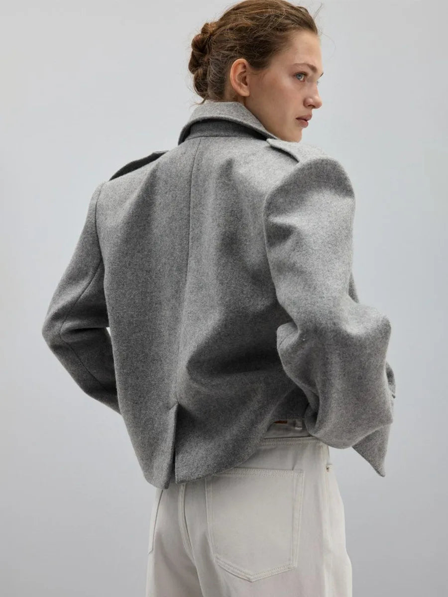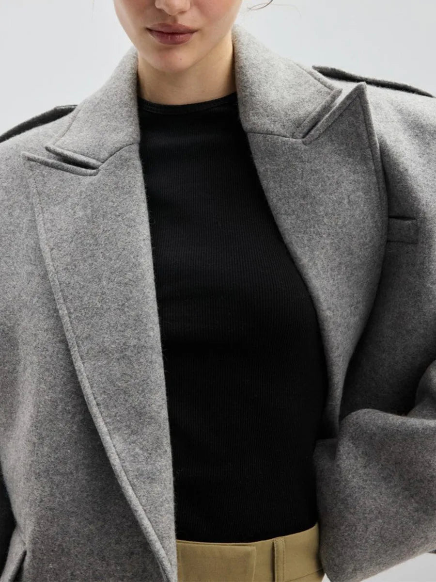 Giacca corta in panno disponibile in grigio melange e cammello. Maxi colletto a revers, maniche lunghe. Finto taschino e tasche anteriori con pattina. Spalle con cinturini e spacchetto posteriore.