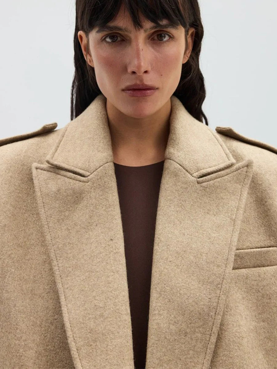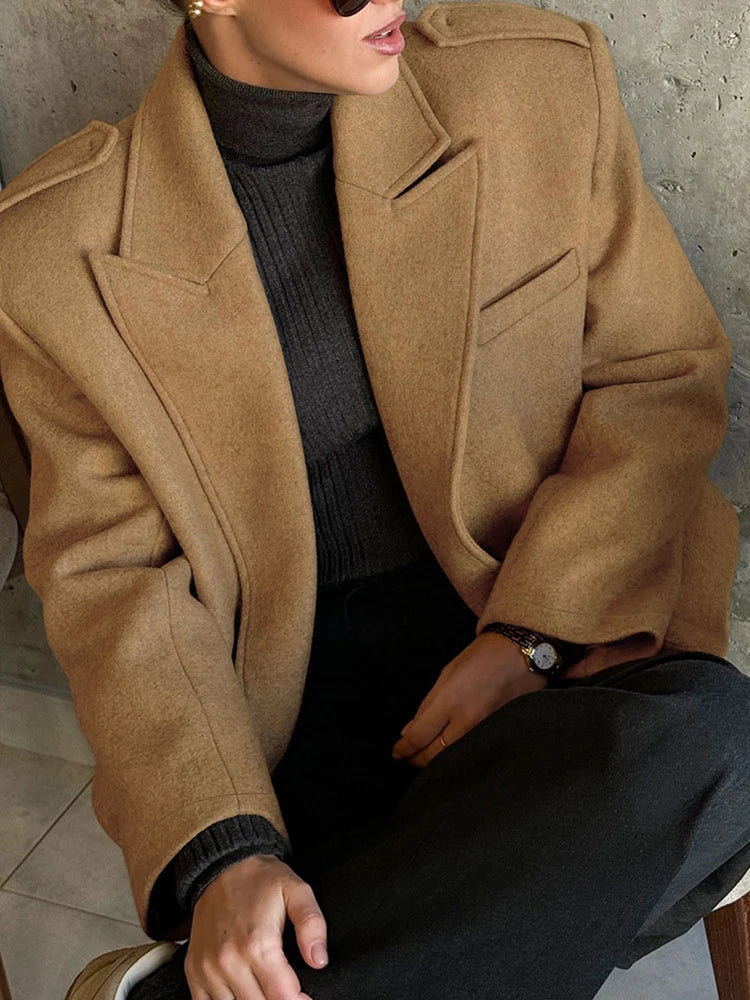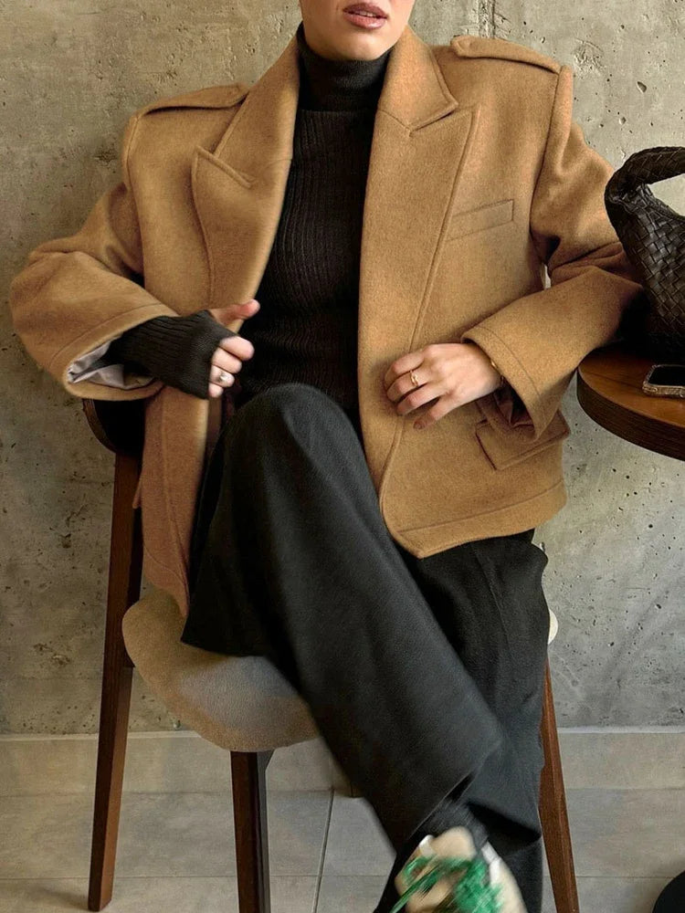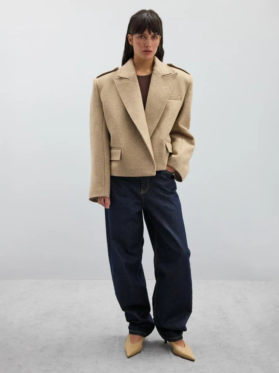 Giacca corta in panno disponibile in grigio melange e cammello. Maxi colletto a revers, maniche lunghe. Finto taschino e tasche anteriori con pattina. Spalle con cinturini e spacchetto posteriore.