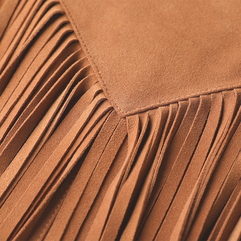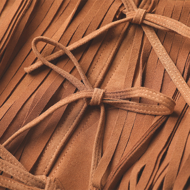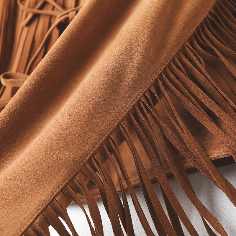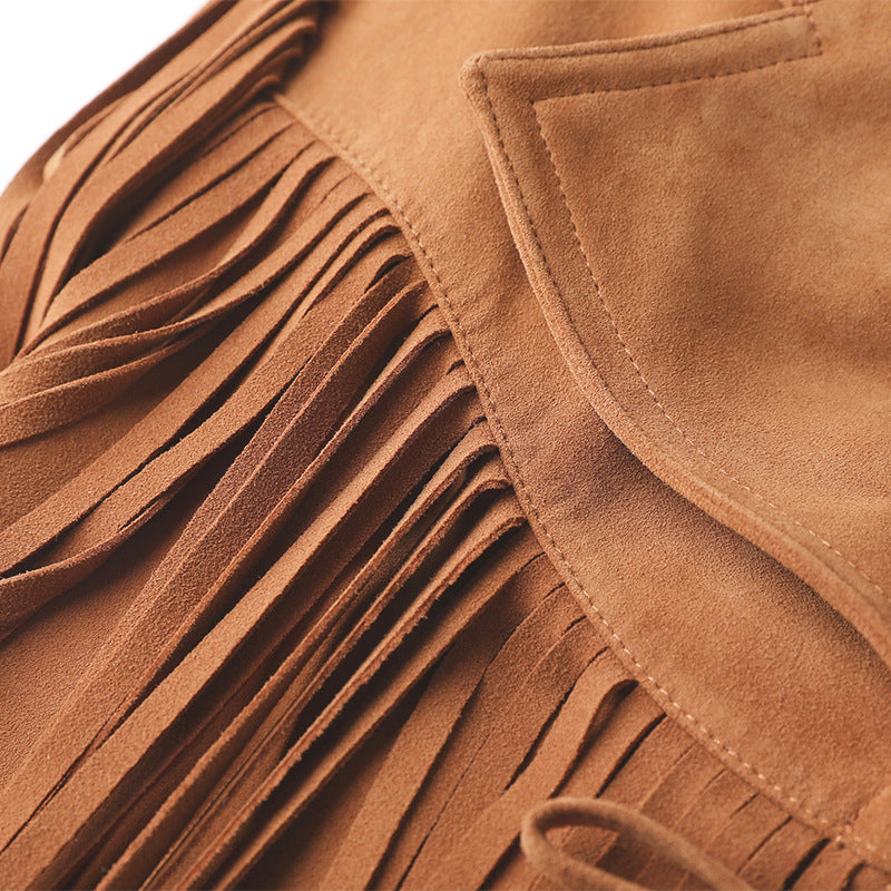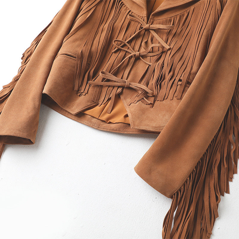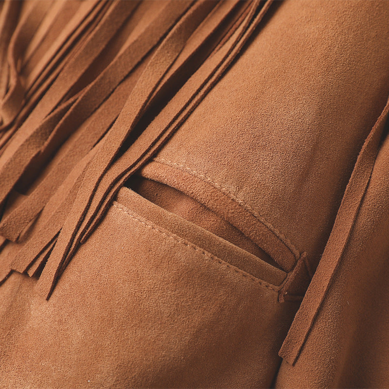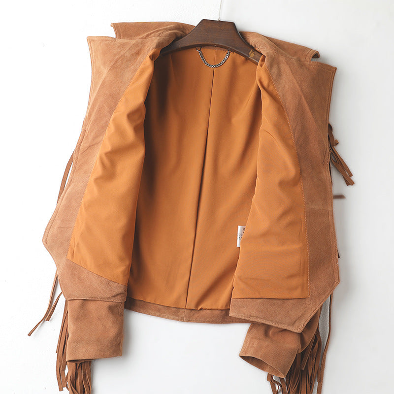 Giubbino in vera pelle scamosciata color cuoio. Colletto a revers, allacciatura frontale con nastrini da annodare. Motivo di frange su maniche e dietro. Tasche anteriori e fodera interna.