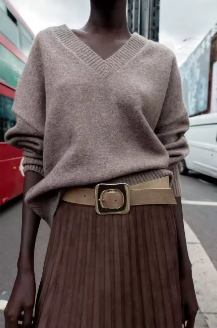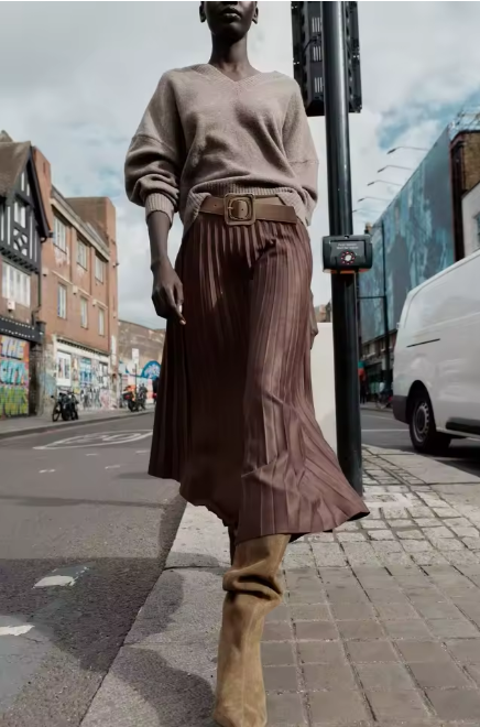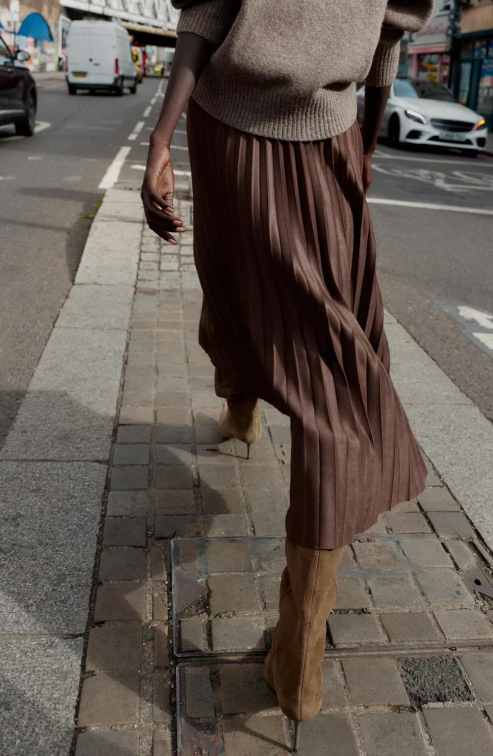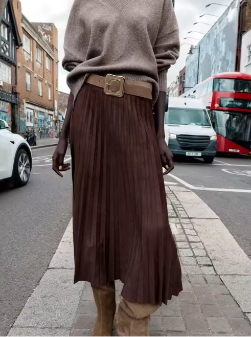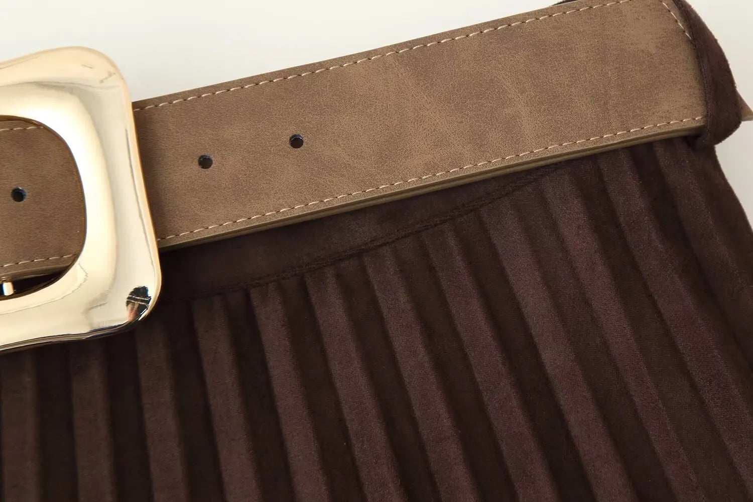 Gonna midi a vita alta in tessuto simil camoscio plissettato con cintura. Chiusura laterale con cerniera nascosta in cucitura.