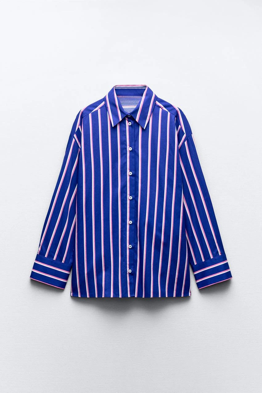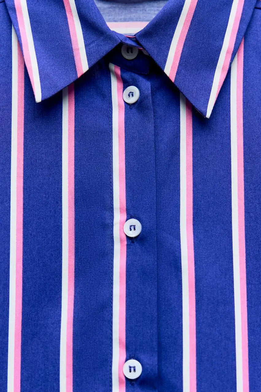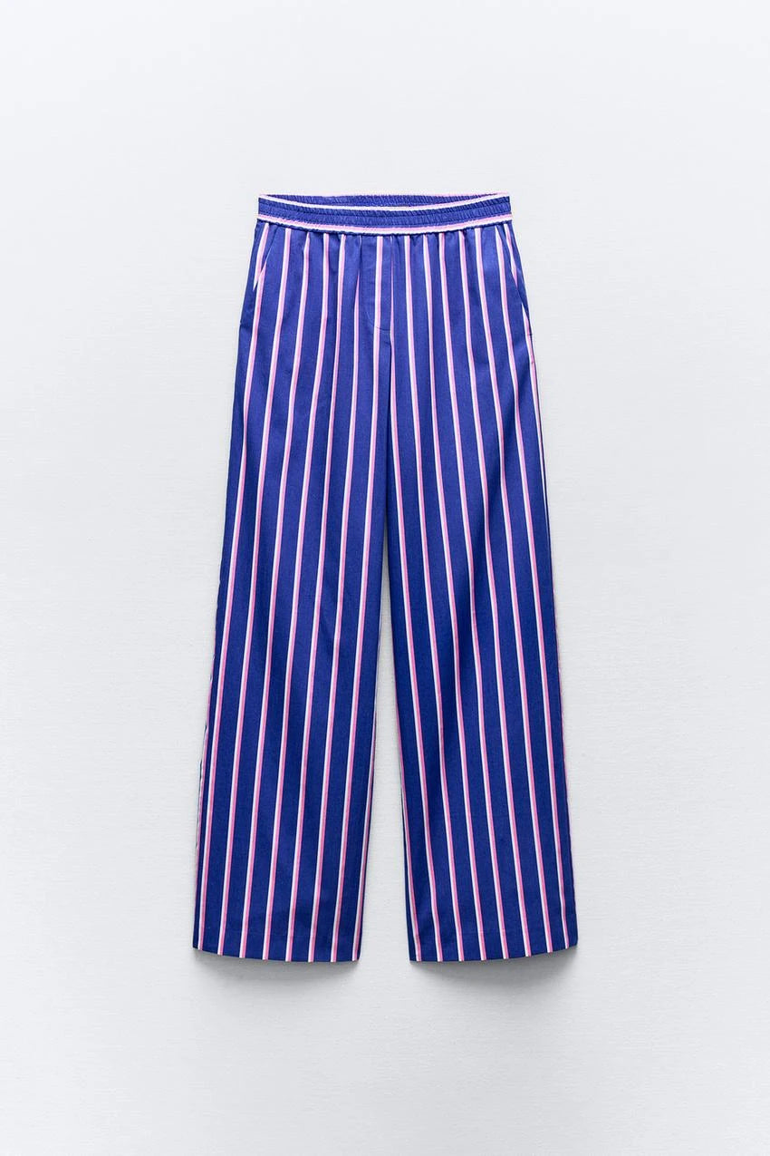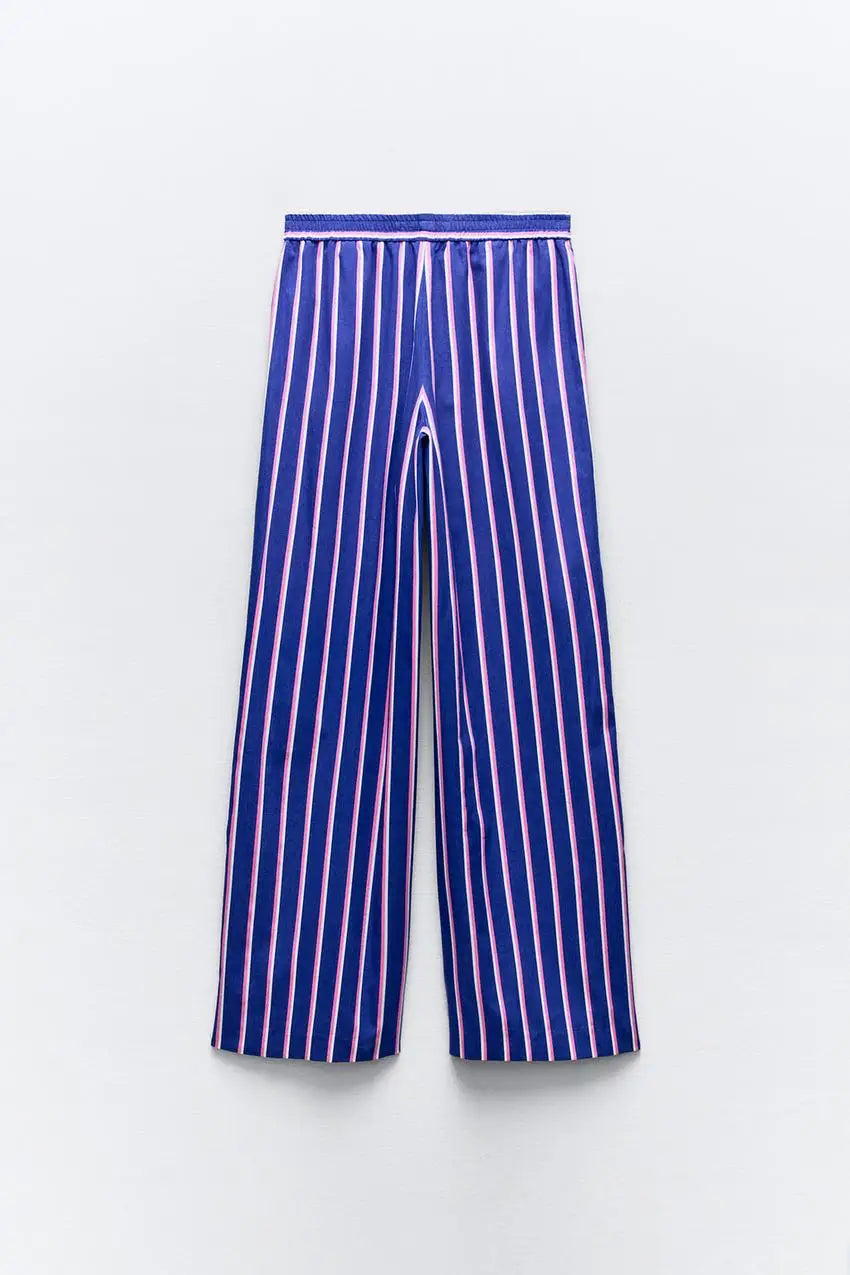 Set in tessuto a righe composto da camicia e pantaloni. Camicia a maniche lunghe, colletto e allacciatura frontale con bottoni. Pantaloni con gamba larga dritta, elastico in vita e tasche anteriori oblique.